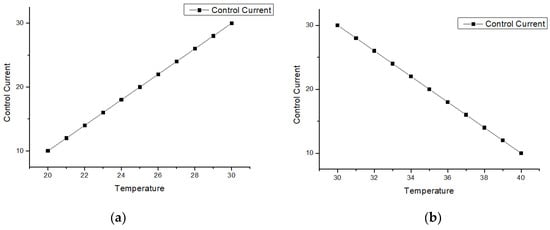In general, the allowable charging temperature of lithium-ion batteries is between 20 and 40 degrees. In addition, the temperature at which rapid charging is possible is 25 to 30 degrees Celsius, so that rapid charging is possible; however, in the case of rapid charging, it is a charging method that affects the lifespan of the battery and the temperature rise. Therefore, appropriate charge control is required to mitigate the battery life and temperature rise. In this paper, we propose a charging method that automatically controls the charging current of the battery according to the temperature using the Auto mode. A method for a user to charge the battery is divided into a user charging mode and an Auto mode. Users can select a charging method and check the charging status in real-time; in the user charging mode, the user selects and charges a fixed control current in a general charging method. On the other hand, in the case of Auto mode, it is a charging method by calculating an appropriate control current based on real-time temperature information; by increasing or decreasing the control current based on the temperature information, it reduces the temperature rise and burden on the battery during charging. Figure 7a,b shows graphs showing the charging current according to temperature; the two graphs can be expressed as Equations (6) and (7). Figure 7a,b graphs are divided based on the battery temperature of 30 degrees. Due to the nature of the battery, the performance varies depending on the temperature. Therefore, the current was determined considering the low and high-temperature conditions. A general charging system is charged in the CC mode through a constant reference current value without considering the temperature state; however, in the proposed method, the charging parameters change in real-time according to the temperature state.