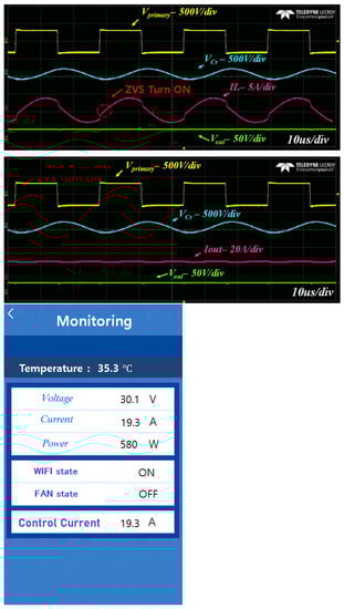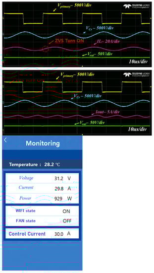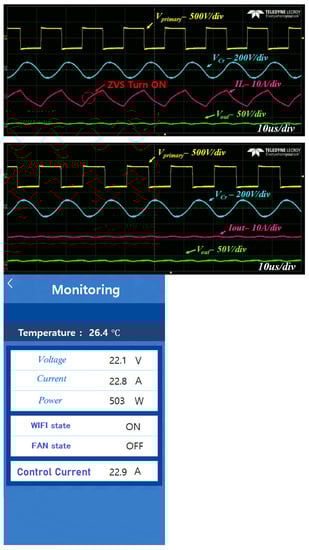 Figure 10 shows the operation waveform and the monitoring interface in the proposed Auto mode. In the case of Auto mode, the control current is determined according to the temperature. Figure 10 shows the time of operation at a relatively high temperature; The control current is determined and operated according to the temperature, and it can be confirmed that the voltage gain is changed by changing the Fast Charging mode and the switching frequency by changing the control current command, thereby controlling the charging current. Moreover, it shows the operation in the ZVS region through the waveform of the inductor and the waveform of the primary side voltage in the charging waveform. Through the interface, the user can easily know the current battery voltage, charging current, temperature and power status.
