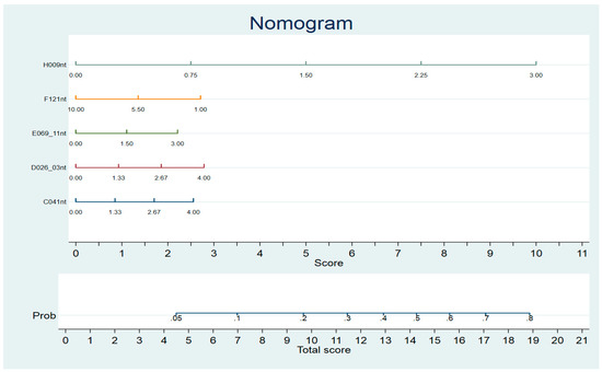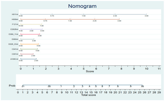 Prediction nomogram for the most comprehensive set of validated determinants. Source: The Stata script at https://drive.google.com/u/0/uc?id=1Ye-eraqZtrLIcVs_SNhsMG0qgY3c5N1H&export=download, last accessed on 1 December 2021.