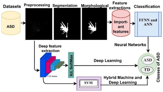 The rest of the paper is organised as follows: Section 2 describes a set of relevant previous studies. Section 3 shows the analysis of the materials and methods for the ASD dataset, and contains subsections for three proposed systems. Section 4 presents the results achieved by machine learning, deep learning and the hybrid technique between them. Section 5 provides discussion and comparison between the proposed systems. Section 6 concludes the paper.