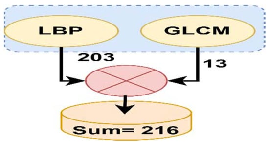 In this work, the most important representative features from the ROI were extracted by two algorithms, LBP and GLCM. Then, the extracted features from the two algorithms were combined with each other to produce strong representative features. Extracting the features from several methods and combining them are two of the most important recent methods that have an effect on accurate diagnosis. The LBP algorithm is one of the methods to extract features. In this study, the LBP was set to a size of 4 × 4. The method selects the central pixel () one at a time and determines the neighboring pixels (), which are 15 pixels, and replaces the central pixel with adjacent pixels in accordance with Equation (14). Thus, each central pixel was replaced by adjacent pixels and the process was repeated until all pixels were replaced by the image; 203 features were extracted for each image.