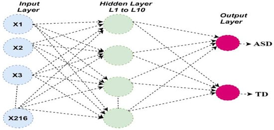 In this study, an ANN was evaluated on the ASD dataset. A total of 216 features (neural cells) were inputted into the input layer, trained through 10 interconnected hidden layers with certain weights, and then fed to the output layer that contains two classes (neural), ASD and TD. Figure 6 describes the ANN architecture of the ASD dataset, in which 216 features were entered and processed through 10 layers and two classes were produced.