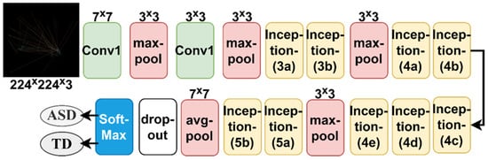 The GoogLeNet model is a type of CNN used for classification, pattern recognition, and many computer vision tasks. The network contains 22 deep layers (27 layers, including pooling layers). It is distinguished by its computational efficiency and greatly reducing its dimensions whilst preserving important information. The first convolutional layer works with a 7 × 7 filter, which is large compared to the sizes of other filters and greatly reduces the dimensions of the input images. All 49 pixels are represented by one pixel whilst preserving the important information. The second convolutional layer reduces the dimensions (size) of the image. The network has three max pooling layers with the size of 3 × 3 that down-sample the input dimensions by reducing the height and width of the image. GoogLeNet also contains one average pooling layer with a size of 7 × 7 that significantly reduces the dimensions of the input image [32]. GoogLeNet contains 7 million parameters as describes in Table 1. Figure 7 describes the GoogLeNet infrastructure for diagnosing ASD.