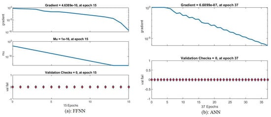 An ANN is a computerised neural network that consists of an input layer with many neurons in it; many hidden layers in which interconnected neurons are carried out and where many complex arithmetic operations are performed to solve the problems to be solved; and an output layer that contains neurons with the same number of classes to be classified [28]. The algorithm analyses and interprets many large and complex data to produce clear patterns. Each neuron is associated with the other by specific w weights that have a role in reducing the error between the predicted and actual output. The ANN algorithm updates the weights in each iteration until a minimum squared error is obtained between the actual output X and the predicted Y, as described by Equation (16).