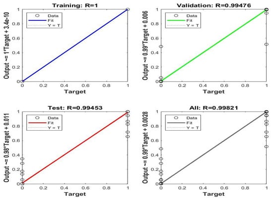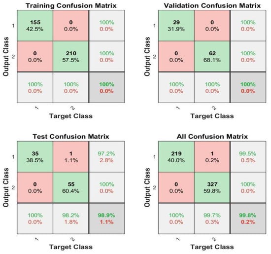The confusion matrix is one of the most important measures of system performance evaluation. It is a form that contains all cases classified correctly and incorrectly between the target classes and the output classes. The confusion matrix summarises all the inputted images representing TP and TN, which indicate correctly classified images, and FP and FN, which indicate incorrectly classified images. In this section, the confusion matrix of the ASD dataset produced by the FFNN and the ANN is described. In the confusion matrix of the ASD dataset produced by the classifier FFNN, the classes of diseases are represented as follows: class 1 is the ASD case and class 2 is the TD case. The FFNN achieved superior results, with accuracy, precision, sensitivity, specificity and AUC of 99.8%, 99.8%, 99.5%, 100% and 99.85%, respectively. Figure 16 describes the confusion matrix of the ASD dataset produced by the ANN classifier during the training, validation and testing phases. The ANN reached accuracy, precision, sensitivity, specificity, and AUC of 100% for all measures during the training and validated phases. Meanwhile, the accuracy, precision, sensitivity, specificity and AUC achieved during the testing phase were 98.7%, 100%, 100%, 98.2% and 99.77%, respectively. The overall accuracy of the ANN classifier was 99.8%.