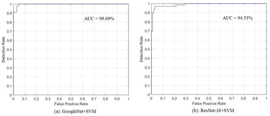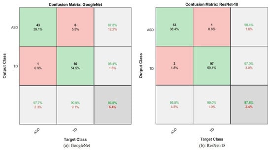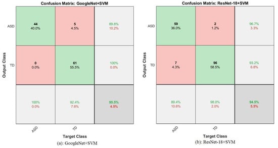 Figure 19 shows the confusion matrix of the ASD dataset produced by GoogleNet + SVM and ResNet-18 + SVM. Correctly classified samples called TP and TN are located on the major diameter and incorrectly classified samples called FP and FN are located on the secondary diameter. Firstly, the GoogleNet + SVM system reached an overall accuracy of 95.5%. Its accuracy on diagnosing ASD and TD classes were 100% and 92.4%, respectively. Secondly, the ResNet-18 + SVM system achieved an overall accuracy of 94.5%. Its accuracy on diagnosing ASD and TD classes were 89.4% and 98%, respectively. Figure 20 shows the results of the two networks for the AUC measure, where GoogleNet + SVM achieved an AUC value of 99.69%, whilst ResNet-18 + SVM achieved 94.51%.
