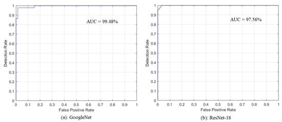 Figure 17 describes the confusion matrix produced by GoogleNet and ResNet-18 models for detection of autism in the ASD dataset. The confusion matrix contains correctly classified samples represented by the major diameter and incorrectly classified samples represented by the secondary diameter. The GoogleNet model achieved an overall accuracy of 93.6%, reaching diagnostic accuracies of 97.7% for the ASD class and 90.9% for the TD class, respectively. Meanwhile, the ResNet-18 model achieved an overall accuracy of 97.6%, reaching diagnostic accuracies of 95.5% for the ASD class and 99% for the TD class, respectively. Figure 18 describes the AUC measure for GoogleNet and ResNet-18 to evaluate the performance of the two models on the ASD dataset. The GoogleNet model achieved an AUC of 99.48%, whilst the ResNet-18 model achieved 97.56%.
