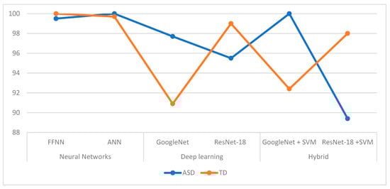 Table 9 summarises the accuracy achieved by all systems for diagnosing autism. Firstly, for the ASD class, the best diagnostic accuracy was achieved by the ANN and GoogleNet + SVM, which reached an accuracy of 100%, whilst the FFNN algorithm achieved an accuracy of 99.5%. GoogleNet and ResNet-18 models achieved 97.7% and 95.5%, respectively. The ResNet-18 + SVM hybrid model achieved 89.4% accuracy. Secondly, for the TD class, the best diagnostic accuracy was achieved by the FFNN classifier, which reached 100%, whilst the rest of the models, which were the ANN, ResNet-18, ResNet-18 + SVM, GoogleNet + SVM, and GoogleNet, achieved 99.7%, 99%, 99%, 92.4% and 90.9%, respectively. Figure 21 also compares the evaluation of all the proposed systems on the ASD dataset at the level of each class.