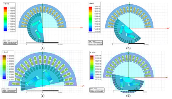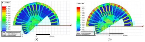 The FEM models of the motors allows for the calculation of magnetic flux density distribution in the cross-section of motor models by solving the magnetic vector potential in the small areas of the mesh that are created in the cross-section of motors. The obtained results of magnetic flux density distribution in the motor cross-section are presented in Figure 13.