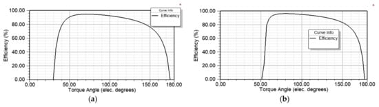 The steady-state characteristic of the efficiency, power factor and torque for BM and M2 are presented in Figure 6, Figure 7 and Figure 8, respectively. The steady-state characteristics should support the data, presented in Table 4, i.e., for the adequate torque angle, the rated values of efficiency, power factor and torque should be obtained.