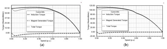 One part of the redesign of the three-phase asynchronous squirrel cage motor into LSSM is to place the magnets inside the rotor, which along with squirrel cage winding, allow starting and synchronization of the motor. The starting point in the analysis was the three-phase squirrel cage motor, a product of Rade Končar, type 5AZ100LA-4, 2.2 kW, 1410 rpm, 5 A, power factor of 0.83, efficiency of 79%. The topology with asymmetric permanent magnet array was chosen for the rotor redesign as the authors’ previous research showed that this topology regarding the analyzed type of the asynchronous motor has some drawbacks, including low overloading capability and relatively low power factor []. Therefore, it was a challenging task to improve the overloading capability, power factor and efficiency with minimum consumption of permanent magnet material while keeping the same power output of 2.2 kW, as it is in the asynchronous motor. The LSSM with the asymmetric permanent magnet array topology is presented in Figure 1a.