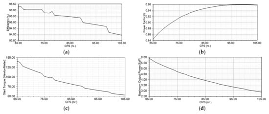 The impact of each varied parameter (CPS, ORD, MT and MW) on efficiency, power factor, starting torque and maximum output power is analyzed by varying the parameter of interest within the prescribed limits while the rest three parameters are constant and equal to the values presented in Table 4 for the model M2. The analysis originates directly from the optometric analysis and allows for the impact of each parameter on motor operating characteristics to be evaluated separately. The impact of CPS on efficiency, power factor, starting torque and maximum output power is presented in Figure 9.