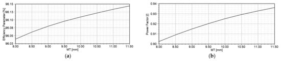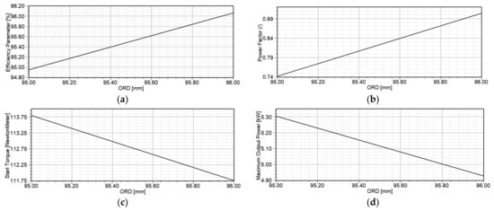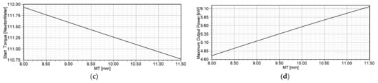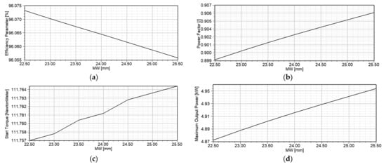 A similar analysis is performed for determining the impact of ORD, i.e., air gap length, on efficiency, power factor, starting torque and maximum output power. The obtained results are presented in Figure 10. The impact of MW on efficiency, power factor, starting torque and maximum output power of the motor is presented in Figure 11. The similar analysis for the impact of MT is presented in Figure 12.