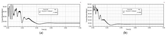 The transient characteristics of speed, torque and line current, when the motor is accelerated with the rated load, are presented in Figure 14, Figure 15 and Figure 16 for models BM and M2, respectively. The motor is supplied with network voltage and accelerated with rated load of 14 Nm coupled to the motor shaft and load inertia of 0.0066 kgm2.