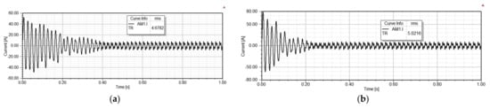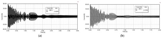 From the results presented in Figure 16, it can be concluded that there is a significant distortion of current waveform due to the presence of harmonics. Harmonics are often present in the current of line-start synchronous motor as a result of permanent magnets inside the rotor. The current higher harmonics cause absorption of distortion power and increase in stray load losses []. The rms value of current of the dynamic model has higher value than the analytically calculated current (Table 3) due to presence of harmonics. These harmonics cause the heating effects in the conductors, as the eddy losses are proportional to the square of the frequency. Moreover, harmonics can cause interference in the protection systems, communication systems, and signaling circuits due to electromagnetic induction []. The harmonics contribute also to the increased noise and vibrations during motor operation. To mitigate the problem with harmonics some authors propose the usage of filters or modification of rotor teeth width [,].