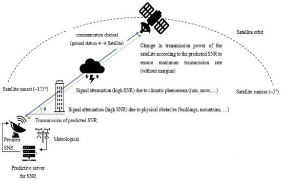 The predicted signal-to-noise ratio (SNR) was sent back from the ground station to the satellite. The aim was to maintain a constant level of satellite link budget, which is conveyed by the desired signal-to-noise ratio level and may be different from the predicted signal-to-noise ratio level. We used the following model: