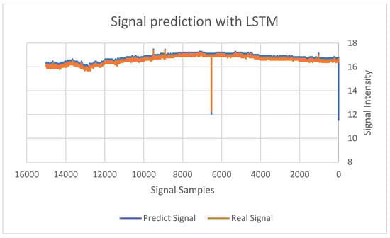The conceptual LSTM process, starting with all 98 samples, was reduced to 20 and, finally, to the resulting SNR value. We defined a hyper-parameters function and, with many empirical experiments, we found that the optimal parameters converged after four epochs. The parameters are: (a) Loss function: mean absolute error, (b) Optimizer: “Adam”, (c) Activation function: “tanh”, (d) Several epochs to saturation 4, 3 layers: 2 LSTM, 1 dense—First layer: 98 neurons, Second layer: 20 neurons, Last layer: 1 neuron. Figure 4 depicts a chart of a one-month sampling experiment using a 10 GHz frequency. It compares the predicted signal graph generated by the LSTM neural network (left) and the actual signal graph (right). We can see that the two charts are very similar, with an average matching of 93%. We revealed similar results for the next four consecutive months, proving that the prediction accuracy depends on various behaviors across seasons.