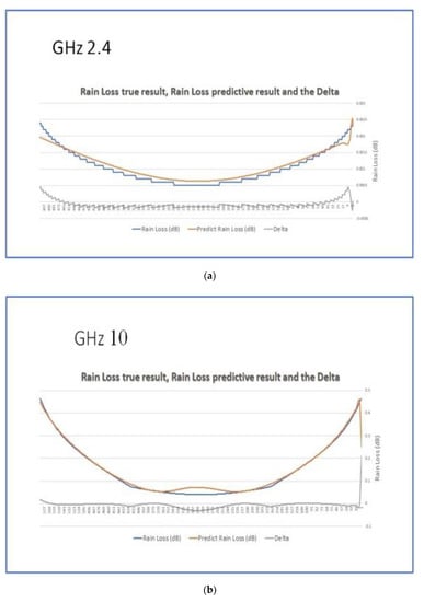 The top chart presents the trained attenuation levels derived from the training data. The bottom graph depicts the actual attenuation levels collected by the satellite. At this stage, we assumed that the LSTM-ML was appropriately calibrated and ready for the prediction process. We executed the same experiment with the same sampled data but with different signal strengths of 2.4 GHz, 10 GHz, 23 GHz, 48 GHz, and 72 GHz. Figure 6a–e depict the results of the experiments performed for each of the five frequencies. The blue and brick lines represent the actual and predicted attenuation levels. The charts below depict the differences between the two charts. We can see the significant similarity between the two graphs. We can also see that all frames demonstrated similar maps with neglected differences.