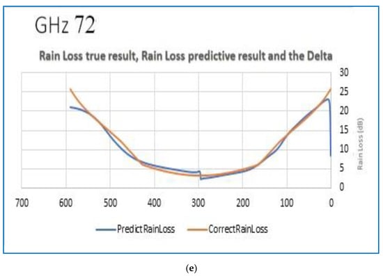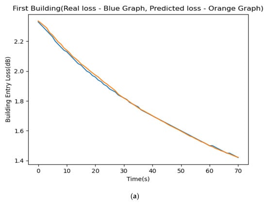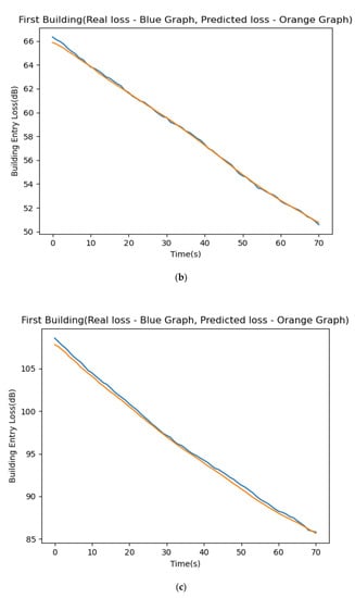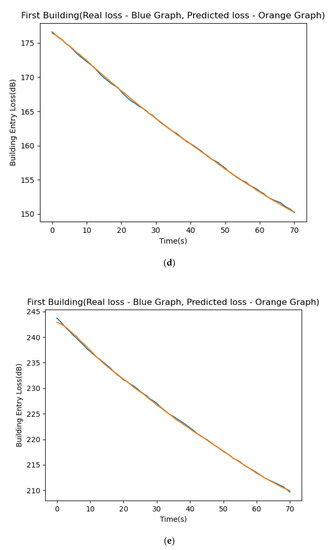 We used the LSTM process and compared the predicted building attenuation levels to the actual attenuation results executed over a wide variety of frequencies, from 2.4 GHz up to 72 GHz. The experiment started with training the LSTM system using 913 sample records from the STK satellite simulation connected to its corresponding earth station. Figure 9 depicts the results of the experiments performed for each of the five frequencies. The average difference between the predicted and actual results was below 2%. It can be seen, visually, from the presented figures. The y-axis represents the signal loss through the building in dB. The x-axis represents times (from the moment the ground station discovers the satellite) in seconds or the satellite’s angle (above the ground) in degrees. The blue and orange lines in the top frame represent the actual and predicted attenuation levels, respectively. We can see how close the two charts are and realize that all other figures demonstrate similar charts. We checked the training results, and they resemble the accurate results to a convincing extent. Figure 9a–e depict the comparison of our experiment’s predicted/true signal strength for the frequency range of 2.4–72 GHz.