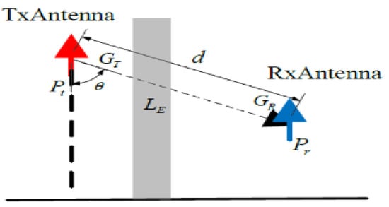 where d is the distance defined in Figure 2 and f is the carrier frequency (GHz). Transmitted power is Pt (dBm) and received power is Pr (dBm). The losses through the building are stated as LE, and sending antenna gain and receiving antenna gain in the transmission path are denoted as GT and GR, respectively. Then we obtain Equation (2):