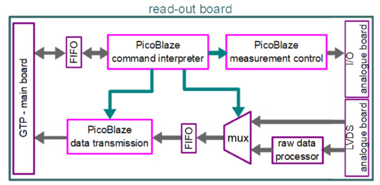 The schema of read-out board software architecture is shown in Figure 2. Three PicoBlaze soft-core processors clocked with 100 MHz frequency are used.