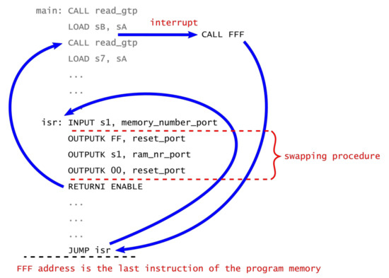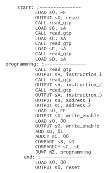 In the programming section, the command interpreter fetches three bytes of one instruction from the mainboard and sends it to the RAM data input port (‘data_in_port’ in Figure 1). The address of the current instruction is determined by the value of the address pointer registers. The PicoBlaze needs three 8-bit ports (‘instruction_X’) to output one instruction and another two ports (‘address_X’) to control the address line of RAM. The command interpreter activates the RAM ‘write_enable’ line for four clock cycles. As a result, the program code stored in RAM is replaced by the new instruction. Then, the processor increments the address pointer and compares it with the expected total number of instructions. If the pointer value is lower than the address stored in sD and sE registers, the processor jumps to the beginning of the loop (‘programming’ label). Otherwise, the processor goes to the last section of the code (‘end’ label).