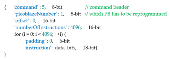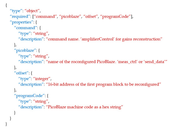 The reconfiguration command is a part of an upper layer communication protocol between the host computer and the EVT4 DAS. The reconfiguration command is sent in JavaScript Object Notation (JSON), which consists of four attribute–value pairs. Figure 8 shows a description of this command prepared in a JSON Schema format. The values of the ‘command’ and ‘picoblaze’ pairs are strings. Using the second string, the application on the mainboard recognizes which PicoBlaze processor should be reprogrammed. The ‘offset’ value is an address of the program block to be replaced. The last pair with the ‘programCode’ attribute contains a PicoBlaze machine code (sent as character data).
