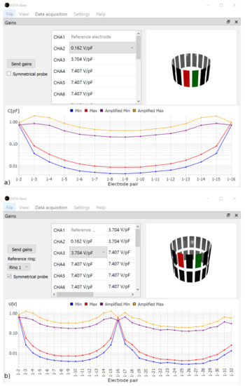 In an ECT sensor, the capacitance value of the opposite electrodes is smaller than for the adjacent electrodes by two or even three orders of magnitude. The gain adjustment is required for the measurement values to fall within the measuring range of the input circuits and to increase the signal-to-noise ratio [13]. The gains for all electrode pairs were selected for both sensors using the graphical user interface of the EVT4 client application (Figure 11). The software enables the selection of the gain in the function of the distance between the stimulating and sensing electrode. The estimated signal value is plotted on the graphs for both the sensor filled with low permittivity material and the sensor filled with high permittivity material. Due to the circular symmetry of the cylindrical sensors, the same gain table was used for each measurement cycle with the different stimulating electrode. For typical sensors, the gains are increased for pairs of opposite electrodes whereas they are decreased for pairs of adjacent electrodes. The software automatically adds the gain levels and corresponding processor instructions to the template file. These instructions are related to reading the gains from the gain table stored in the PicoBlaze’s scratchpad memory. In the scan algorithm, the value of the gain in the measuring channel is adjusted at each cycle using the information about the distance of electrodes. The gain table in which the position corresponds to the distance between the excitation and sensing electrode was used. An initial rotation of this table depends on the read-out board number.