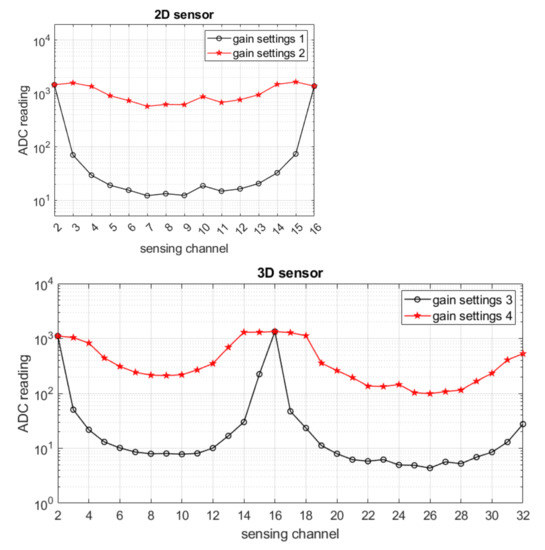 ADC readings in a sensing channel number (pair of electrodes) function at different gains. Measurement for 2D (top) and 3D sensor (bottom). The first channel is connected to an excitation electrode. All gains in settings 1 and 3 are equal to 0.162. The gains in settings 2 and 4 are equal to 7.407 except for the channels corresponding to the adjacent electrodes (0.162 for immediately adjacent electrodes; 3.704 for electrodes distant by two electrodes).