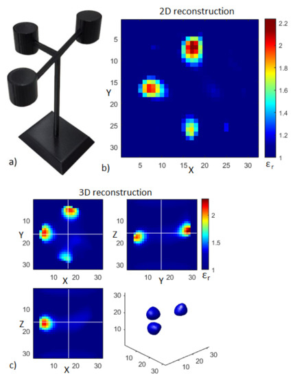 The test object was measured using the 2D and 3D sensors incorporating arbitrarily selected gain settings. The object was made of PLA using 3D printing and consisted of three cylinders (Figure 13a). Each cylinder had a different position in the XY plane and the Z axis. The diameter and height of cylinders were equal to 20 mm. The sensing domain (inside of a sensor) was a cylindrical volume with a diameter of 98 mm and a height of 25 mm for the 2D sensor and a height of 70 mm for the 3D sensor. The slice of the test object was reconstructed from 2D measurements using an iterative Landweber algorithm (Figure 13b). Two cylinders reconstructed more poorly because only a part of their volume was into the sensing domain. The slices of the 3D volume reconstructed from 3D measurements are shown in Figure 13c.