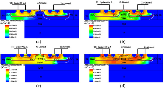 TCAD-simulated current density distribution of PTBSCR (L = 0.5 μm) at different levels of current when T2 and G are grounded. The T1 is subject to (a) Ipulse = 50 μA, (b) Ipulse = 60 μA, (c) Ipulse = 75 μA, (d) Ipulse = 150 μA.