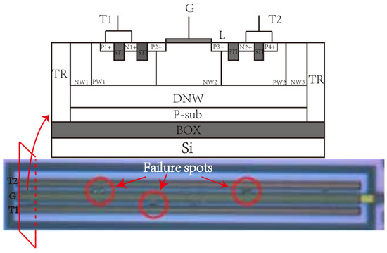 The physical failure analysis (PFA) was carried out after the TLP test. Three metal layers have been removed to locate the failure spots. As shown in Figure 5, the failure spots caused by silicon melting appear in the junctions of the NW2/PW2 and N1+/PW1. As shown in Figure 4, the electric field at the reverse-biased NW2/PW2 junction is larger than other positions (impact ionization is related to the electric field), and the current almost flows through these reverse-biased PN junctions, as shown in Figure 3d. The heat generated at the reverse-biased junction is the product of high-voltage dropping on the junction and a high ESD current, which causes temperature rises until silicon melting. The distributions of failure spots have indirectly verified the accuracy of simulated results in Figure 3 and Figure 4.