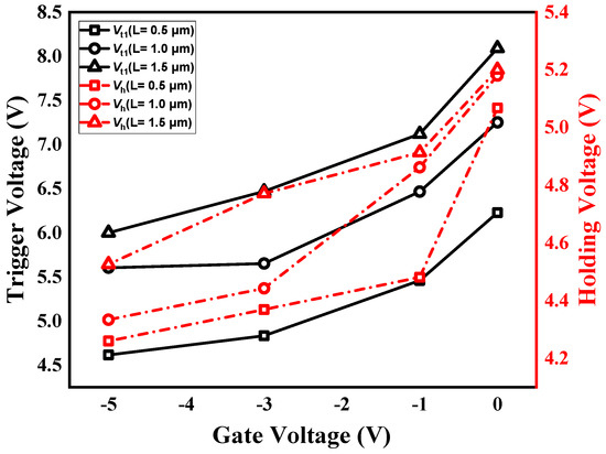 Trigger voltage, holding voltage for the PTBSCR (L = 0.5 μm) versus different gate voltages.