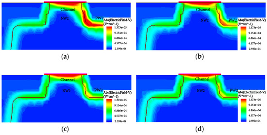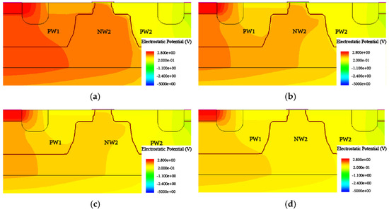 According to the analysis before, the second triggering is caused by the turn-on of the PNPN structure (composed of P1+, NW2, PW2, N2+), and the holding point appears after the second triggering. Before the third snapback, the current flows through P1+, PW1, NW2, PW2, and N2+ and the voltage drop on the reverse-biased NW2/PW2 junction contributes the most to the holding voltage. We chose the same pulsing current to analyze the distribution of electric field and electrostatic potential when applying the different gate voltages. As shown in Figure 8a–d, gate voltage has an evident influence on the electric field distribution in NW2/PW2. The gradually weakened electric field in the NW2/PW2 junction will induce the undermined electrostatic potential with reducing gate voltage. In Figure 9a–d, the electrostatic potential in NW2/PW2 is gradually decreasing with reducing gate voltage, and the Vh of PTBSCR is decreasing with the decreasing electrostatic potential in NW2/PW2.