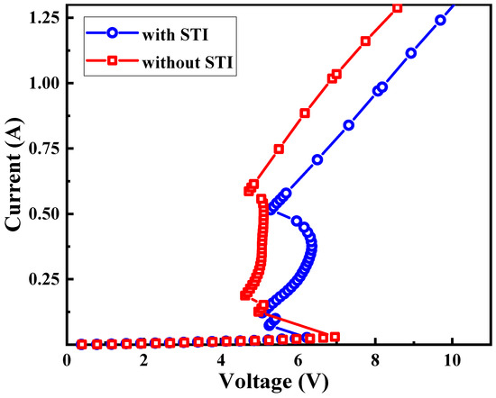 To investigate the influence of STI on critical parameters, the TLP I-V curves of structures (with/without STI) are measured. Figure 10 shows the test curves of different devices. The TLP test system measures I-V characteristics of the devices when T1 is subject to a positive ESD stress, the T2 and G are grounded. The multi-snapback phenomenon of the I-V curve exists in structures with or without STI. In addition, inserting STI decreases the Vt1 and increases the Vh. The first snapback is caused by the turn-on of PNP BJT. The STI inserted in the device is used to isolate the PN junction. The P1+/N1+ junction of PTBSCR without STI consumes the voltage drop on the current flow path, which reduces the voltage drop on the NW2/PW2. Thus, the device without STI triggers with more difficulty. Thus, the Vt1 of PTBSCR with STI is smaller. After being triggered completely, the STI increases the current path, and thus, the Vh is larger.