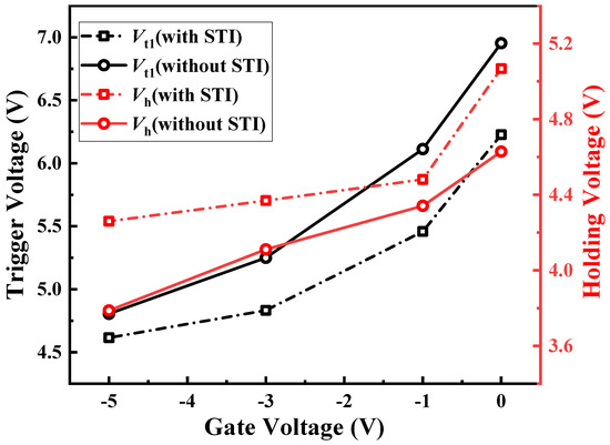 Figure 11 shows the effect of gate voltage on the Vt1 and Vh of PTBSCR (with/without STI). As expected, the Vt1 and Vh of the device have decreased regularly with a decreasing gate voltage. The Vt1 decreases from 6.2 V/7.0 V to 4.6 V/4.8 V. The Vh decreases from 5.1 V/4.6 V to 4.3 V/3.8 V when gate voltage decreases from 0 V to −5 V.