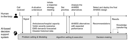 Based on the use of AI for the AHMSS design, a disaster response scenario with the AI-based decision support system is illustrated in Figure 6. In the figure, an AI-based decision support system continuously interacts with humans in-the-loop, providing relevant information for decision making throughout the AHMSS design process.