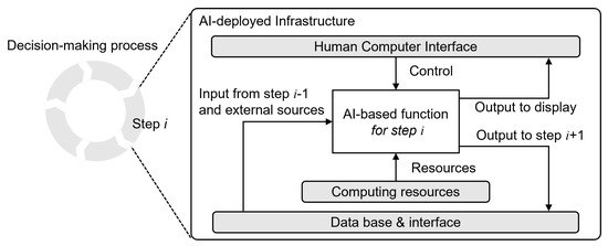 Understanding behaviors of AI functions for a decision-making process and identifying the relevant system elements required to perform the functions properly are a key step in developing an AI-based decision support system. To support the key step, upon understanding the use of AI in the AHMSS design process as a basis, we describe an AI functional block according to the four dimensions of a functional description—input, output, control, and resource—as proposed in the Integration Definition for Function Modeling (IDEF0) approach [25].