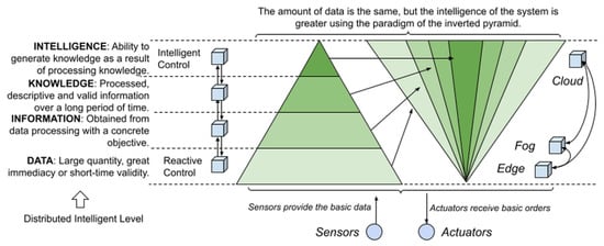 At the low level of the pyramid, the primary data characteristic is the short period in which the data are valid. For example, a vehicle detection sensor will report the vehicle presence at a specific time moment and in a particular place. As the elements of the system grow, specifically in lower layers of the classical pyramid (i.e., a large number of CNs), a considerable amount of data is available. Many connected elements that provide this massive data have led to the emergence of the Internet of Things (IoT) or Industry 4.0 paradigm. Including the IoT and Industry 4.0 paradigm in distributed intelligent systems implies reviewing the knowledge pyramid, such as the one proposed in [11]. Currently, there is a consensus to divide distributed systems in a layer close to the physical environment (fog, edge in the hardware) and cloud to provide massive data processing, advanced computing or machine learning. These layers (or ’areas’) have changed the design of system architectures, forcing a turn away from the hierarchical models towards highly connected horizontal models. In these new models, intelligence becomes distributed and not exclusively at the top of the classic pyramid of knowledge model (Figure 1). Consequently, a system architecture must support intelligence at the edge level but provide all available data to the cloud level. Edge elements, as CNs, can provide some intelligent processing that helps fog and cloud obtain the data processed and avoid the fog and cloud elements from making decisions that a CN can make.