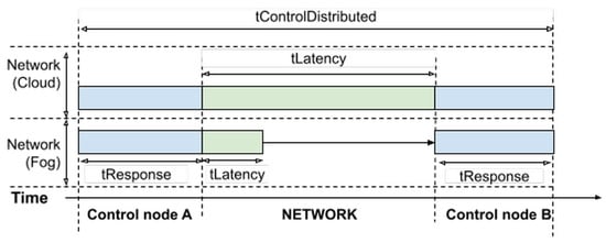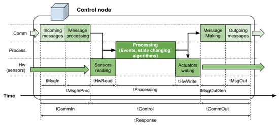 Regardless of the configuration used in a CN, one must measure its performance to understand its ability to assimilate some intelligent algorithms. Absolute and relative errors measure the efficiency of the control action. Low error values imply effective control, even though the processing and the communications load can amount to 100% of micro-controller use. Consequently, high efficiency could mean high electricity consumption [17]. Therefore, the cost of such efficiency may be higher than the efficiency achieved. However, for a CN, or set of CNs, the goal is to obtain a low response time and low micro-controller processing load, in addition to common error values. Thanks to data processing, the control error can be decreased from other CN. In that case, it is convenient to evaluate whether it is efficient to wait for the remote data or to act locally with a more significant error. When a CN must communicate through a shared communications system, you have a distributed system. In this case, in addition to the times considered in Figure 2, the times invested in the communication tasks between nodes should be considered as an integral part of the CN response time. Figure 3 shows all times involved due to the use of connected CN devices.