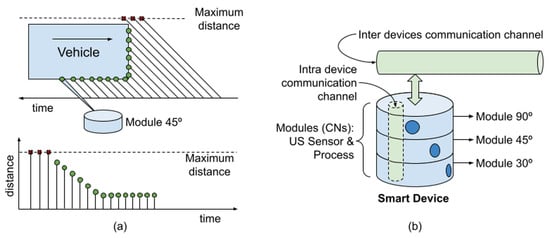 Method to detect the vehicle’s front and side using US rays (a), and the device implemented with US modules (b).