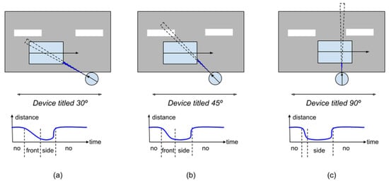 The way to measure vehicle speed and length is to compare different distance measurements of a vehicle as it approaches the US sensor. Figure 4a shows how a sensor with an inclination of 45° to the road axis can detect the front and side of a vehicle. These distance measurements are the maximum possible when no vehicle is present. The distance measurement becomes a downward ramp when the front of a vehicle is detected. Next, the measurement becomes a constant distance as soon as the side is detected. Finally, when the vehicle disappears, the measurement becomes the maximum possible again.