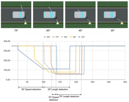 From the simulation data, it seems appropriate to use control modules with angles close to the road axis. Consequently, angles of 30° and 45° are selected for experimentation on the prototype. The length calculation is based on the lateral samples. In all cases, the number of samples is similar, although the shortest distances are obtained with the angles perpendicular to the road axis, i.e., with the angles of 75° and 90°. Since the 75° speed error is the largest, it seems appropriate to use only one sensor at 90° for the calculation of the vehicle length.