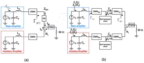 In order to achieve class-J operation for the main and auxiliary devices, their OMNs, which share the same structure, are designed in a modular way: in particular, each OMN is composed of three parts, as shown in Figure 1b. A second harmonic matching network (OMN 2nd), terminated by a second harmonic short (SC 2nd), synthesizes the proper impedance at the second harmonic, then the matching network OMN 1st sets the proper load at the fundamental frequency without affecting the second harmonic. Based on Equations (3) and (8), the intrinsic main reflection coefficient at fundamental for the class-J DPA can be written as: