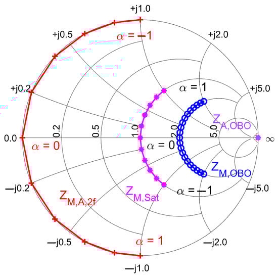 Based on Equation (13), the obtained class-J reflection coefficient is as a function of x, , and , thus gives more degrees of freedom to design the output matching network with respect to the classical class-AB case. Figure 2 shows the impedance of class-J at the fundamental and second harmonics for = 50 . The real part of the fundamental impedance at OBO and saturation is constant, whereas the imaginary part changes from to , where k equals 1 and 2 at saturation and at OBO, respectively.