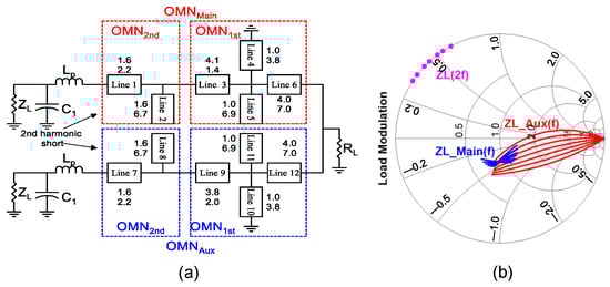 (a) Schematic of the OMNs (dimension length and width are in millimeters), and (b) corresponding simulated fundamental and second harmonics load modulation for the main and auxiliary PAs.