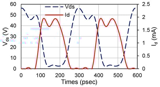 Simulated waveforms of the drain-source voltage and drain current at 3.5 GHz.