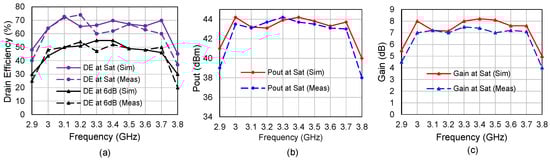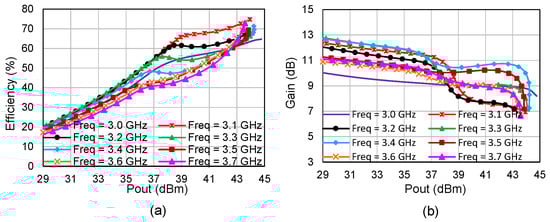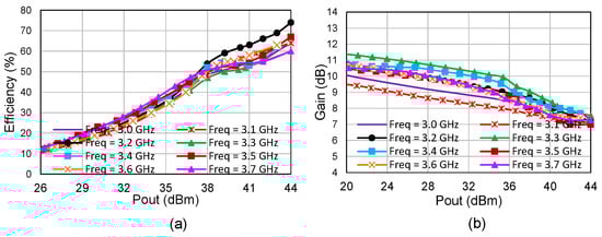 The DPA performance is evaluated in simulation in the frequency range 3–3.7 GHz, under the following operating conditions: V, V, V, with a quiescent drain current of 112 mA. Figure 6 shows the CW simulation results of the drain efficiency and gain over the operating bandwidth.