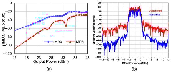 A two-tone analysis is also performed at 3.5 GHz to evaluate the linearity of the DPA. The third and fifth order intermodulation distortion (IMD3 and IMD5), shown in Figure 7a versus output power, remain better than −20 dBc and −31 dBc, respectively, for < 43 dBm. In order to assess the system-level behavior, the DPA is simulated using a 16-QAM modulated signal and 6 dB PAPR. The input and output power spectrum at the center frequency of 3.5 GHz and with 5 MHz bandwidth are shown in Figure 7b. At an average output power of 36 dBm, the simulated ACPR is −30 dBc, and which is comparable to the results shown in [,].