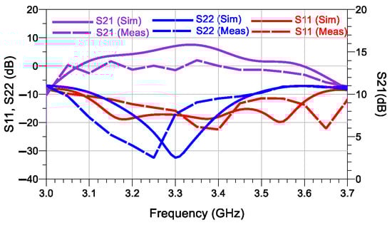 Figure 8 shows the photograph of the proposed class-J Doherty PA. The amplifier has been characterized from 3 GHz to 3.7 GHz, in the following operating condition: V, V, V, mA. The scattering parameters of the DPA are illustrated in Figure 9, showing a flat gain of around 12 dB over the target 700 MHz bandwidth, with and better than -10 dB, confirming also a good agreement between simulation and measurement.